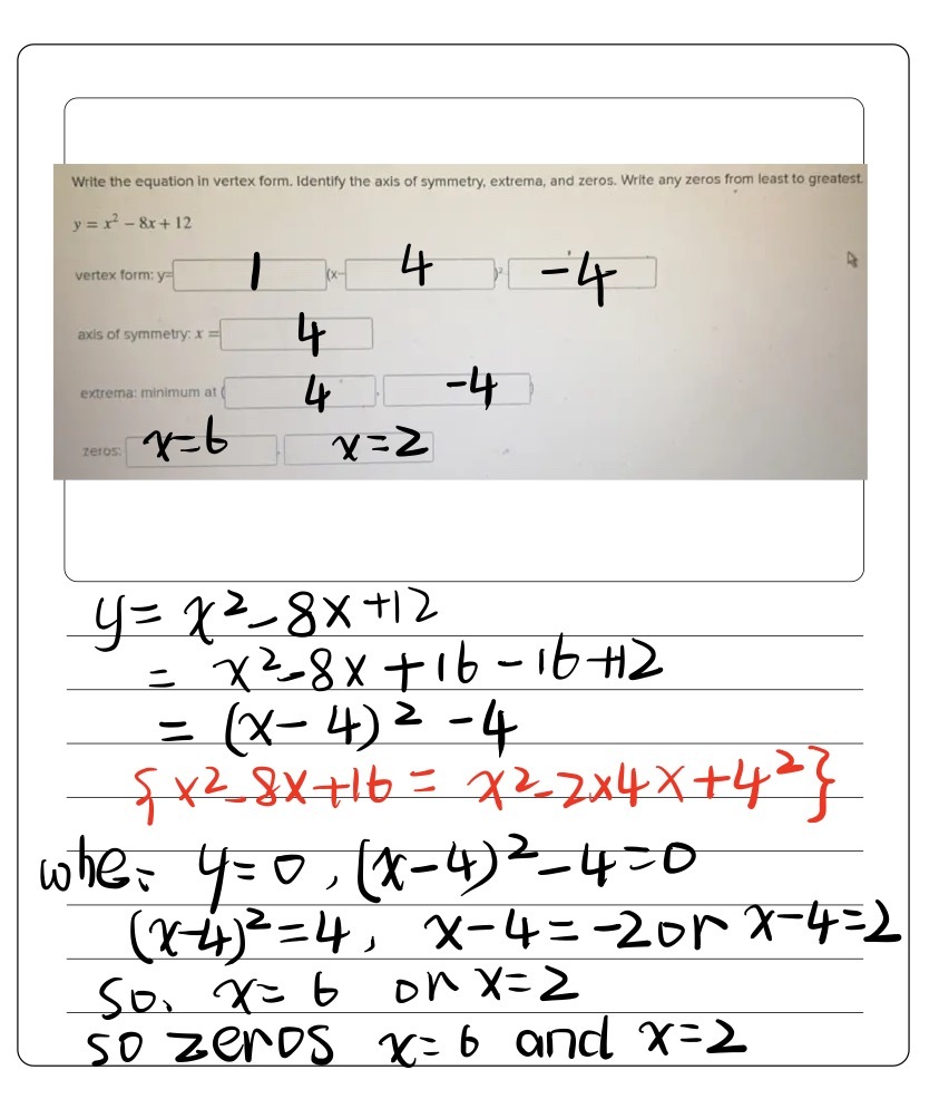 How to find a parabola's equation using its vertex form. Did you find mistakes in interface or texts? By comparing the final equation with the vertex form, math processing error. Vertex form of a quadratic equation. Write the quadratic equation in vertex form.